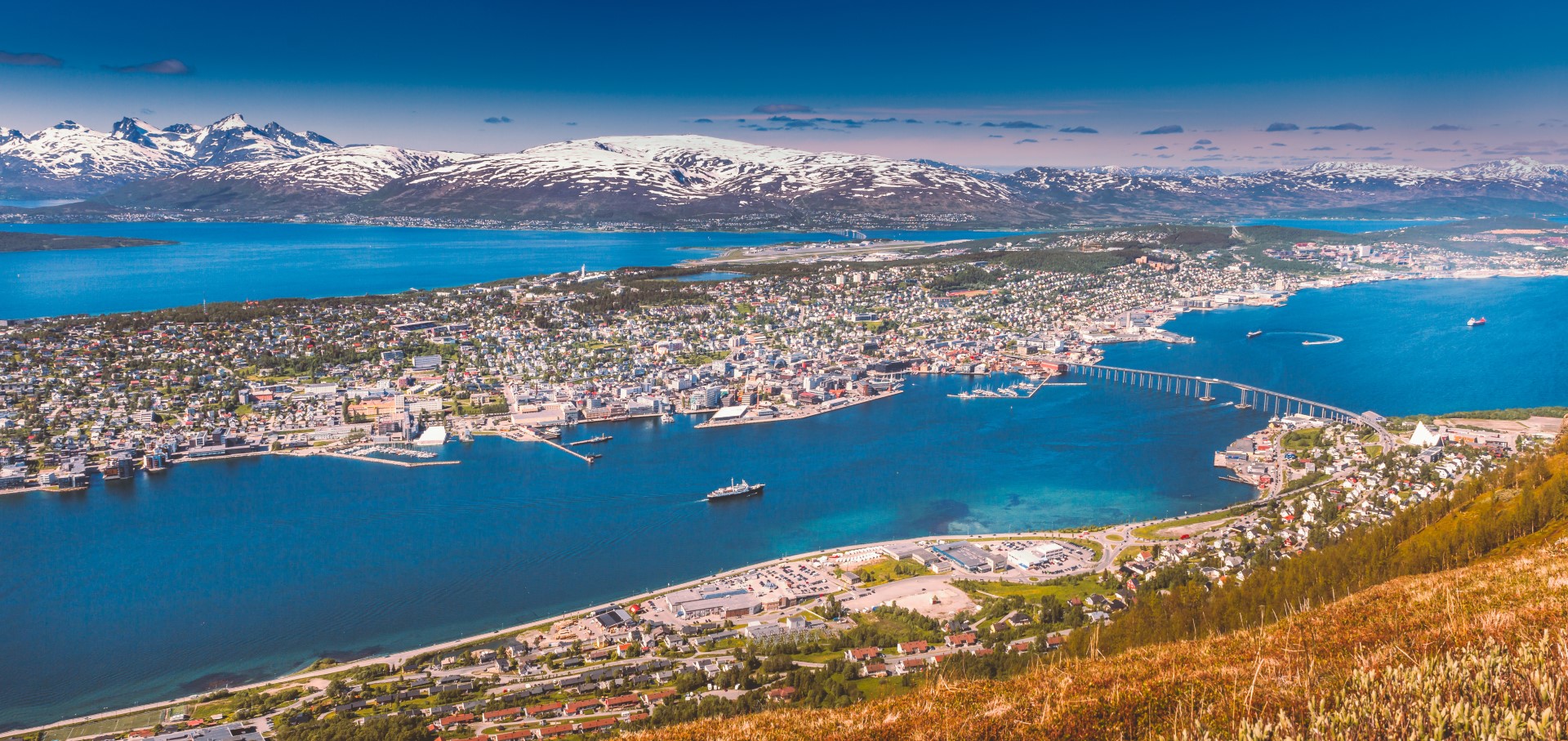 Tromsø si adagia su un arcipelago incastonato tra le maestose montagne e il mare cristallino del Mar di Norvegia, nel nord della Norvegia. La città principale si trova sull’isola di Tromsøya, collegata alla terraferma da ponti moderni e da una natura ancora selvaggia e intatta. Intorno, le vette montuose si ergono con fierezza, sfidando il cielo, mentre le acque circostanti ospitano una ricca biodiversità marina. Il territorio, fatto di fiordi profondi e vallate ricoperte di tundra, si presta a escursioni e attività all’aria aperta di ogni genere.