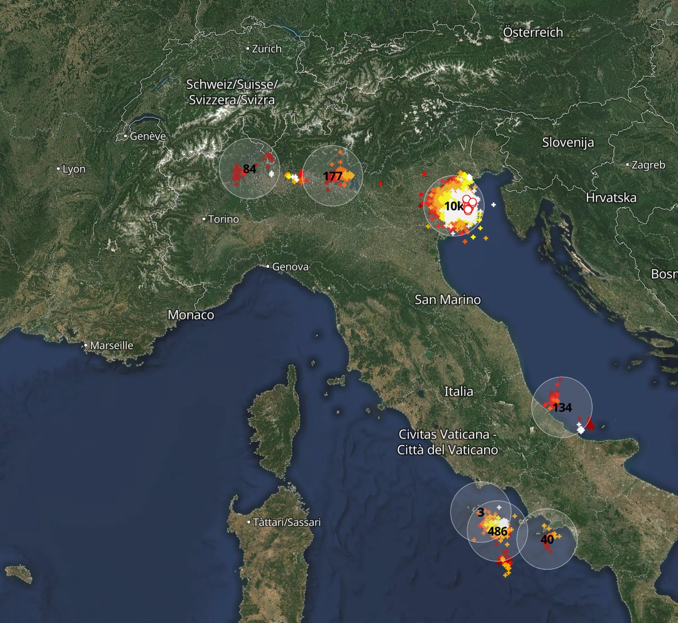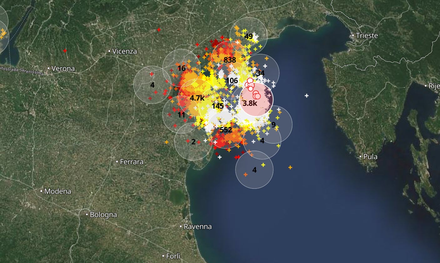 Quello che ha stupito questa mattina è stata la presenza di un temporale violentissimo in Veneto, che ha prodotto nelle ultime due ore più di 10.000 scariche elettriche. Una cifra impressionante per un evento improvviso e notturno.