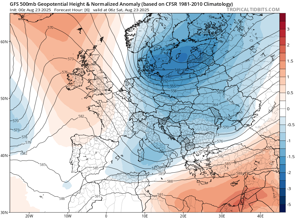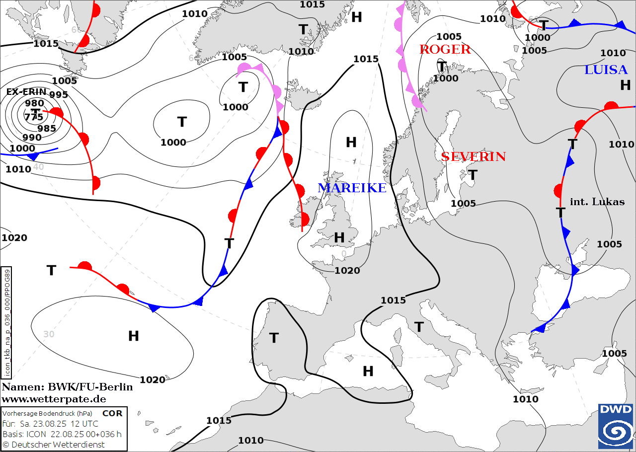 A livello sinottico, una piccola saccatura al suolo sta coinvolgendo le regioni settentrionali italiane; questa appartiene a un’area di bassa pressione che ha il suo minimo a nord della Lapponia, denominata Roger dall’Istituto Meteo tedesco. Anche in alta quota si osserva una debole linea di saccatura che si estende fino alle regioni meridionali italiane e al Nordafrica.