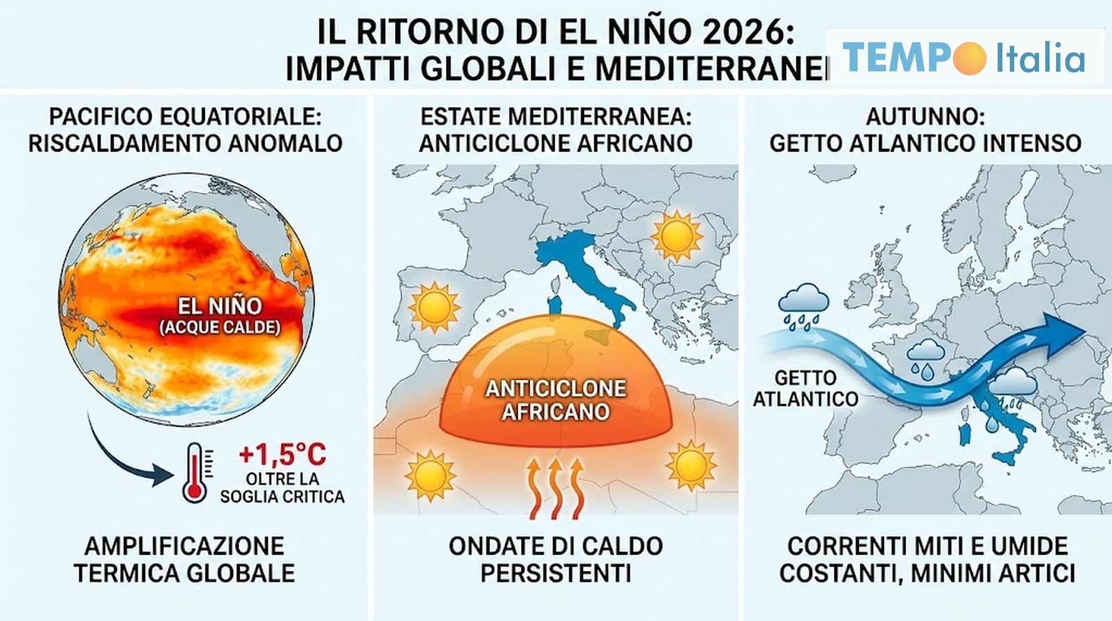 In un contesto dove gli oceani sono già caldi, El Niño potrebbe spingere la temperatura globale a sfiorare o superare la soglia critica di +1,5°C o +1,6°C rispetto all’epoca pre-industriale. Per l’Italia e il Mediterraneo, questa configurazione unita a un Artico ai minimi potrebbe significare un getto atlantico molto intenso e correnti miti e umide costanti.