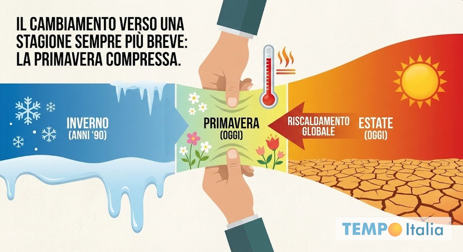 Negli ultimi decenni, a partire dagli Anni Novanta, la Primavera ha subito una trasformazione evidente a causa del Riscaldamento Globale, mostrandosi mediamente più calda rispetto al passato. Questo fenomeno si manifesta con anomalie termiche positive sempre più frequenti nei mesi di Marzo, Aprile e Maggio, con ondate di calore precoce che portano massime tipicamente estive già prima del tempo. Gli Anticicloni Subtropicali sono diventati più invadenti, innescando fasi di stabilità che un tempo erano molto più rare. Molti esperti parlano ormai di una Primavera compressa, una stagione di mezzo che tende a rimpicciolirsi mentre l’Inverno si presenta più mite e l’Estate si allunga, conquistando fette di calendario che appartenevano ai mesi primaverili. Il passaggio tra il freddo e il caldo avviene in modo brusco, eliminando quella gradualità che caratterizzava il clima del XX secolo.