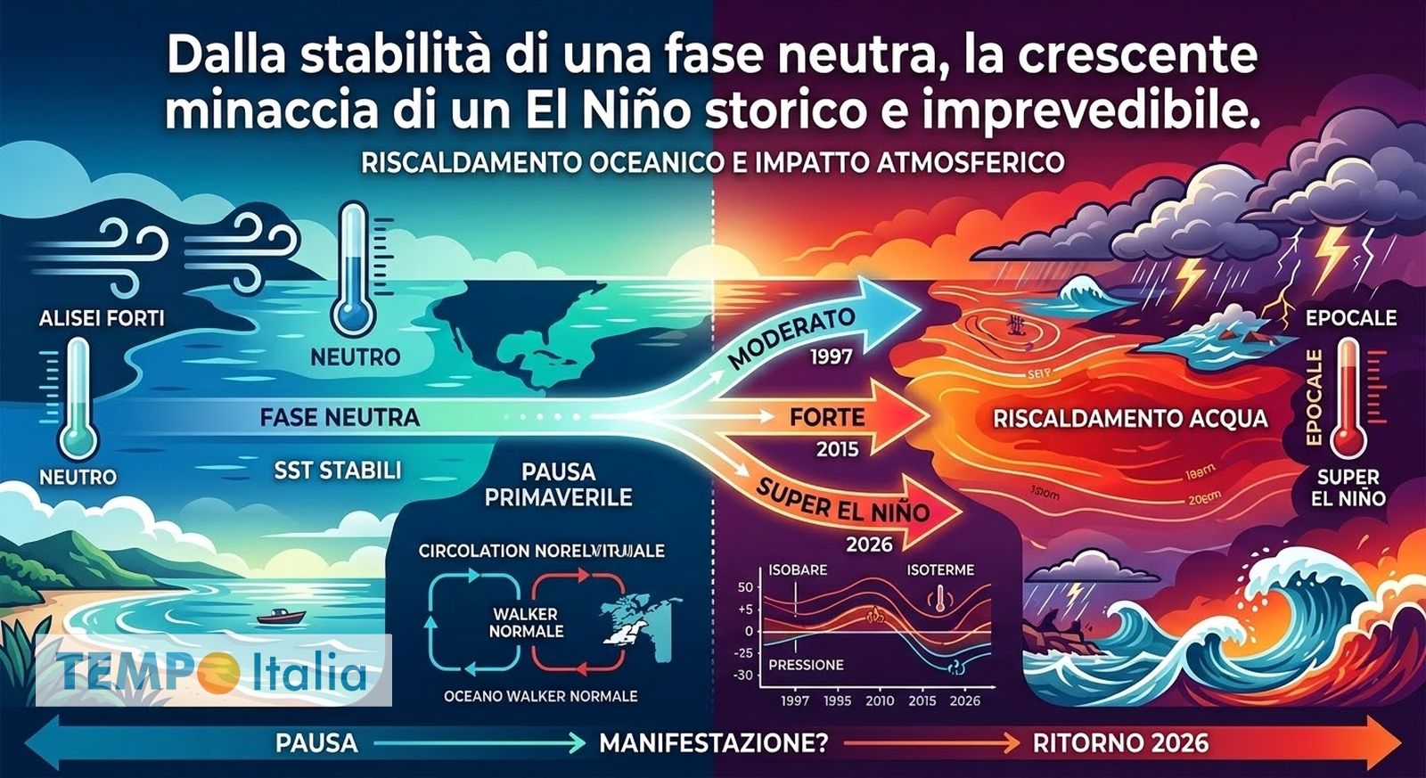 Per quanto concerne l’evoluzione futura, l’ipotesi prevalente è che, terminata questa pausa primaverile, la probabilità che il fenomeno de El Niño si manifesti diventi sempre più alta, sebbene occorra precisare che in questo periodo dell’anno le proiezioni risultano sempre piuttosto insidiose, pertanto non è ancora possibile stabilire con assoluta certezza quale sarà la reale magnitudo dell’evento. Alcune simulazioni ipotizzano addirittura che El Niño possa palesarsi già a metà anno, a patto che l’atmosfera inizi a reagire prontamente ai mutamenti della distesa oceanica, un passaggio che per ora non appare del tutto compiuto. Inevitabilmente, quando si evoca El Niño, la memoria corre subito ai disastri meteorologici del 1997 o del 2015, annate che si sono guadagnate l’appellativo di super El Niño, tuttavia al momento i riscontri scientifici non permettono di confermare una simile deriva catastrofica, trovandoci ancora nel perimetro delle probabilità. Sappiamo che un ritorno del fenomeno nel 2026 è altamente verosimile, ma definire se si tratterà di un episodio moderato o di qualcosa di epocale è decisamente prematuro.