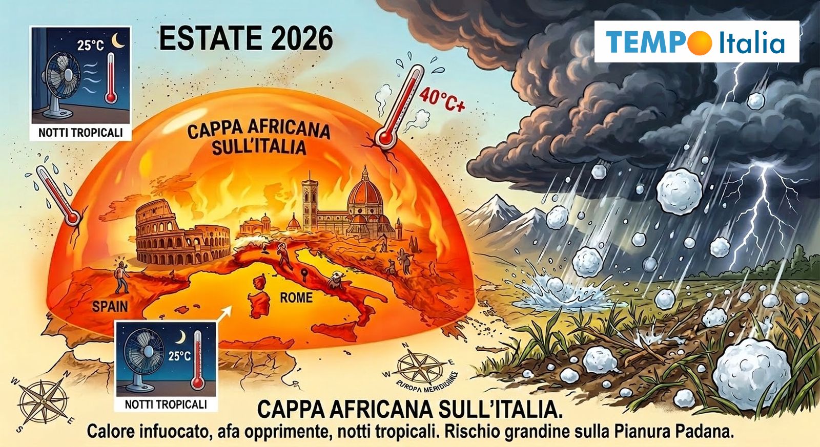 (TEMPOITALIA.IT) I primi tepori precoci di questo marzo 2026, caratterizzato da un clima fin troppo primaverile, stanno accarezzando le nostre piazze, ma questa piacevole parentesi non è destinata a durare e il pensiero corre inevitabilmente a ciò che ci attende tra pochi mesi. La prossima estate 2026 si preannuncia infatti come una stagione dal meteo potenzialmente estremo, un mix esplosivo che mescola ondate di calore eccezionali a fenomeni atmosferici violenti. Le indicazioni delle ultime stagioni parlano chiaro e non lasciano molto spazio all’ottimismo, poiché quasi ogni estate si sta presentando più calda e più instabile delle precedenti, seguendo il trend climatico ormai ben delineato da anni. Da una parte subiremo il fiato africano, dall’altra rischiamo la furia improvvisa di temporali violentissimi, quando l’anticiclone africano verrà bucato da infiltrazioni di aria umida e fresca di origine atlantica. A tutto questo bisogna aggiungere gli effetti di El Niño.