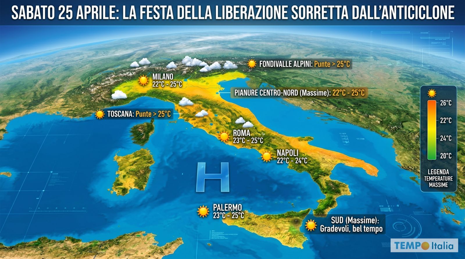 La giornata del 25 Aprile si profila con cieli in prevalenza sereni o poco nuvolosi su tutta la penisola. Qualche velatura alta potrà transitare senza conseguenze pratiche, mentre sui rilievi alpini e appenninici potranno svilupparsi nel pomeriggio innocui cumuli senza precipitazioni degne di nota. Per Milano, Roma, Napoli e gran parte delle aree pianeggianti le condizioni saranno decisamente favorevoli a una giornata all’aperto.