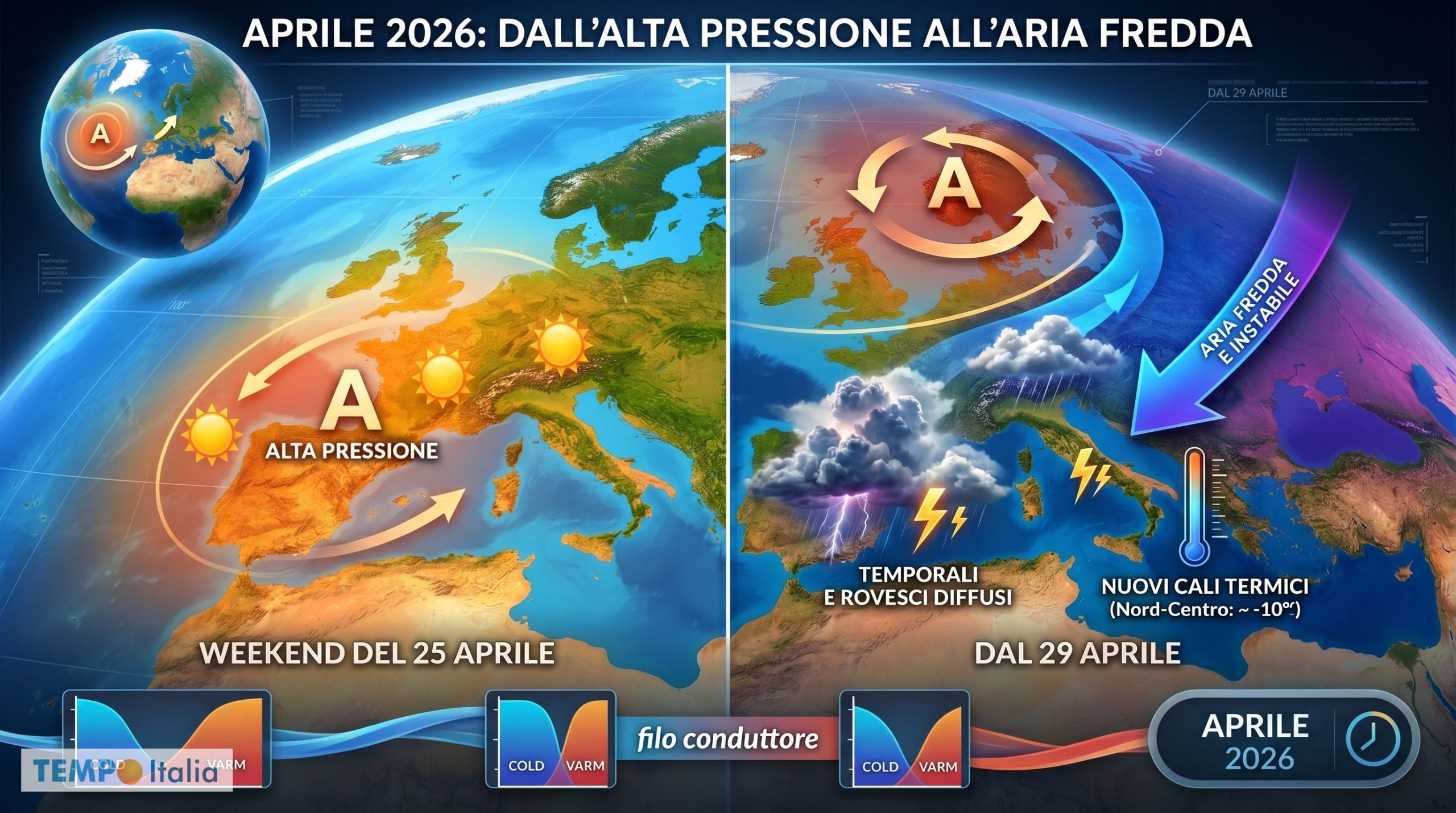 (TEMPOITALIA.IT) Il bel tempo del weekend del 25 Aprile avrà vita breve. I modelli ECMWF e GFS convergono già su uno scenario che non lascia tranquilli per la chiusura di Aprile: a partire da Martedì 28, e con più decisione da Mercoledì 29 Aprile, l’atmosfera tornerà a cambiare radicalmente, riproponendo quella dinamica instabile che ha già caratterizzato la settimana appena trascorsa.