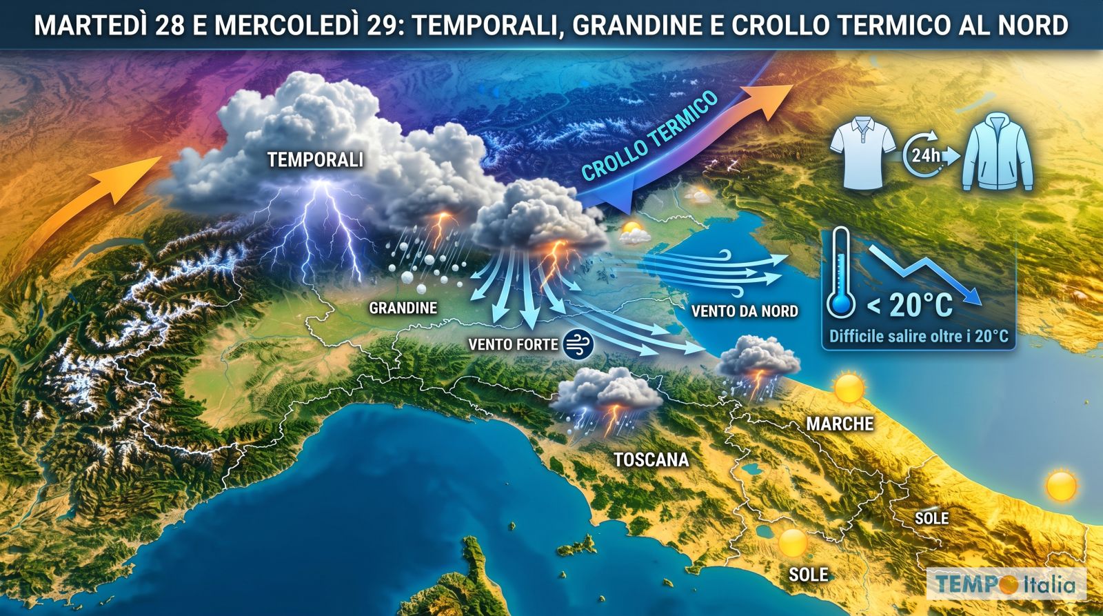 Martedì 28 e Mercoledì 29: temporali, grandine e crollo termico