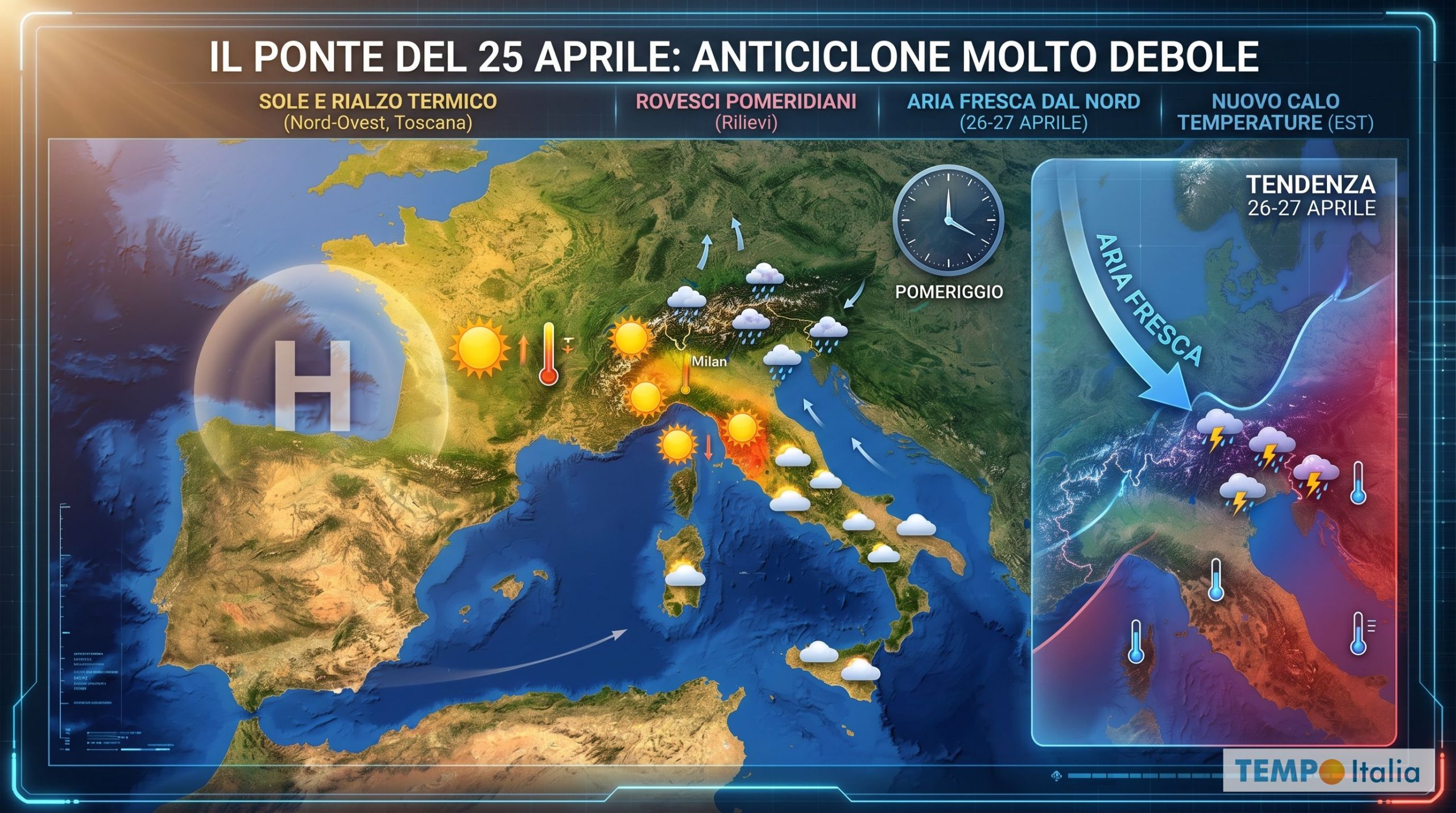 A partire da Venerdì 24 Aprile l’anticiclone comincerà a espandersi verso l’Europa occidentale e la penisola, riportando il sole e un rialzo termico che si farà sentire con più decisione sulle regioni di Nord-Ovest e sulla Toscana. Per il 25 Aprile si preannuncia un potenziale miglioramento, ma attenzione però a non archiviare la questione troppo in fretta. L’Italia si verrà a trovare lungo il margine orientale dell’anticiclone, una posizione che lascia spazio a deboli correnti settentrionali capaci di contenere i valori termici e di favorire qualche rovescio pomeridiano sui rilievi. La tregua stabile, per di più, potrebbe avere vita breve: tra Domenica 26 e Lunedì 27 Aprile una nuova discesa di aria fresca dal Nord Europa potrebbe puntare le Alpi e il Triveneto, riportando instabilità e un nuovo calo delle temperature sulla parte orientale della penisola. Uno scenario ancora da definire nei dettagli, ma sufficiente a consigliare prudenza a chi sta organizzando il fine settimana festivo.