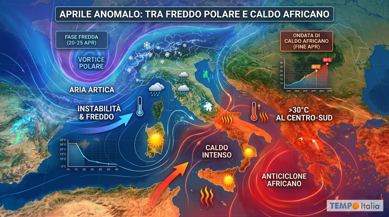 (TEMPOITALIA.IT) Questo Aprile 2026 sta avendo poco o niente di normale, tra caldo quasi estivo in deciso anticipo e ondate di severo maltempo che hanno a tratti riportato giù le temperature di molti gradi, ma sempre in modo transitorio e a carattere locale. Il bello, se così si può chiamare, è che il mese non ha ancora finito di sorprendere. Anzi, quello che arriva nei prossimi giorni è un copione già scritto, che va da una bordata di freddo a un colpo di caldo africano, passando per i primi temporali seri della stagione.