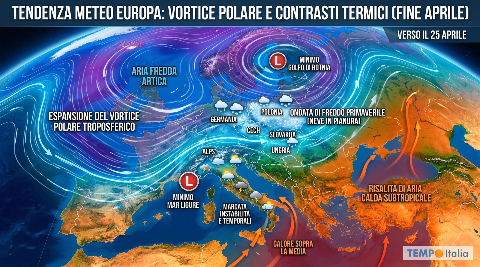 Verso il 25 Aprile è attesa un’espansione di aria fredda di notevole intensità sul Centro-Nord europeo. Un Vortice Polare che coinvolge tutte le quote, dalla troposfera fin quasi al suolo, con un minimo barico nel Golfo di Botnia e un secondo minimo sul Mar Ligure, generato dall’intrusione di aria fredda che andrà ad appoggiarsi sull’arco delle Alpi. Il risultato concreto sarà una vera ondata di freddo primaverile appena oltre il confine alpino, con nevicate in pianura in Polonia, Germania, Repubblica Ceca, Slovacchia e persino Ungheria. Un fenomeno che si ripete con una certa frequenza nelle ultime stagioni primaverili, ma che in un contesto di anticicloni estesi come quello delle ultime settimane acquista ancora più rilievo.