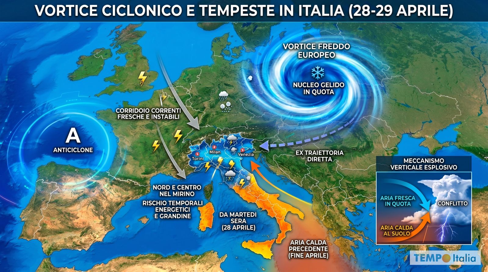 Il risultato di questo scontro tra masse d’aria sarà una fase di marcata instabilità temporalesca che coinvolgerà in primo luogo le regioni settentrionali. Piemonte, Lombardia e il Triveneto saranno le aree più esposte, con i primi temporali già a partire dalla giornata di Martedì 28 Aprile. Il meccanismo è quello classico della Primavera avanzata: il suolo e i bassi strati dell’atmosfera sono ancora surriscaldati dalla precedente ondata di caldo, l’aria fresca arriva in quota, il contrasto verticale diventa esplosivo. Temporali energetici, localmente anche di forte intensità, con grandinate che in questa stagione possono presentarsi anche con chicchi di dimensioni rilevanti.