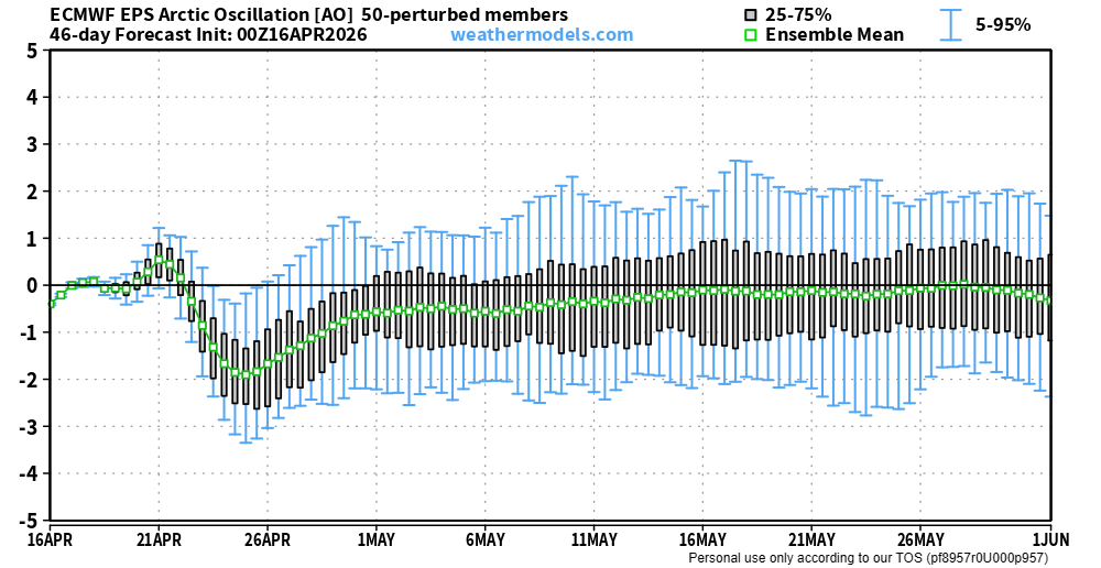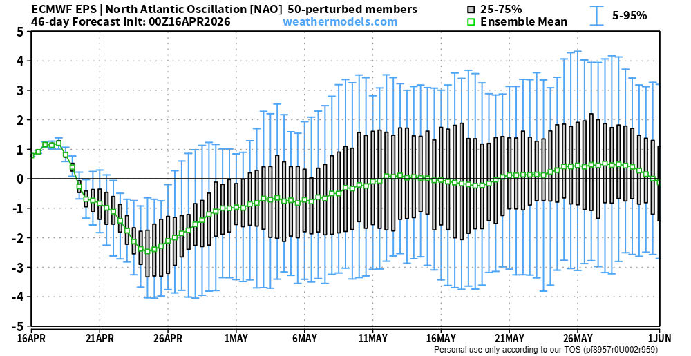 Ci tengo a sottolineare che il doppio crollo di AO e NAO appare robusto e ben supportato dalla maggioranza dei membri dell’ensemble dell’ECMWF, almeno per quanto riguarda la fase di fine aprile.