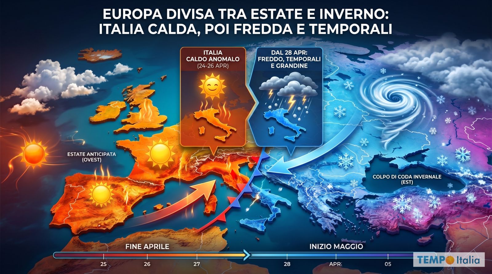 (TEMPOITALIA.IT) Lo scenario meteorologico che si profila sull’Europa tra la fine di Aprile e l’inizio di Maggio ha del paradossale. Due imponenti masse d’aria di natura opposta si contenderanno il continente nello stesso momento, creando una configurazione raramente vista in questa stagione: caldo quasi estivo a ovest, colpo di coda quasi invernale a est, con l’Italia nel mezzo a fare i conti con entrambe.
