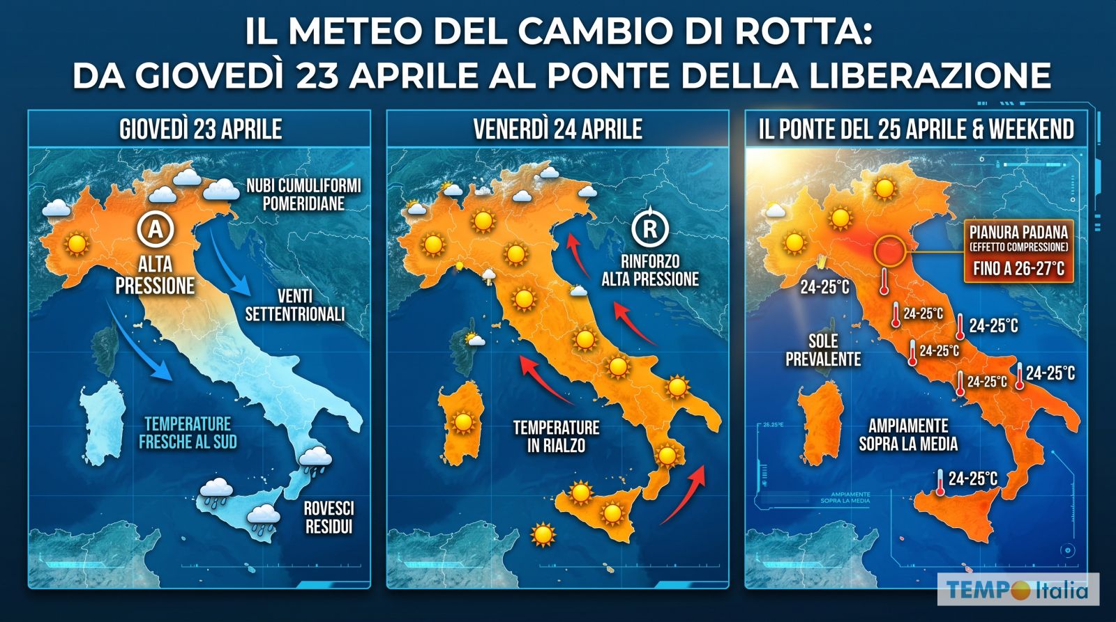 (TEMPOITALIA.IT) La primavera di questo Aprile 2026 continua a sorprendere, stavolta però in senso positivo. In questi giorni l’arrivo di correnti più fredde dai Balcani ha innescato temporali intensi e un calo termico che ha riportato le temperature nelle medie stagionali, localmente, nei versanti orientali, anche al di sotto, ma l’anticiclone si prepara a riprendere il controllo della scena già a partire da Giovedì 23 Aprile. La svolta sarà rapida e percepibile, soprattutto dopo queste giornate turbolente.