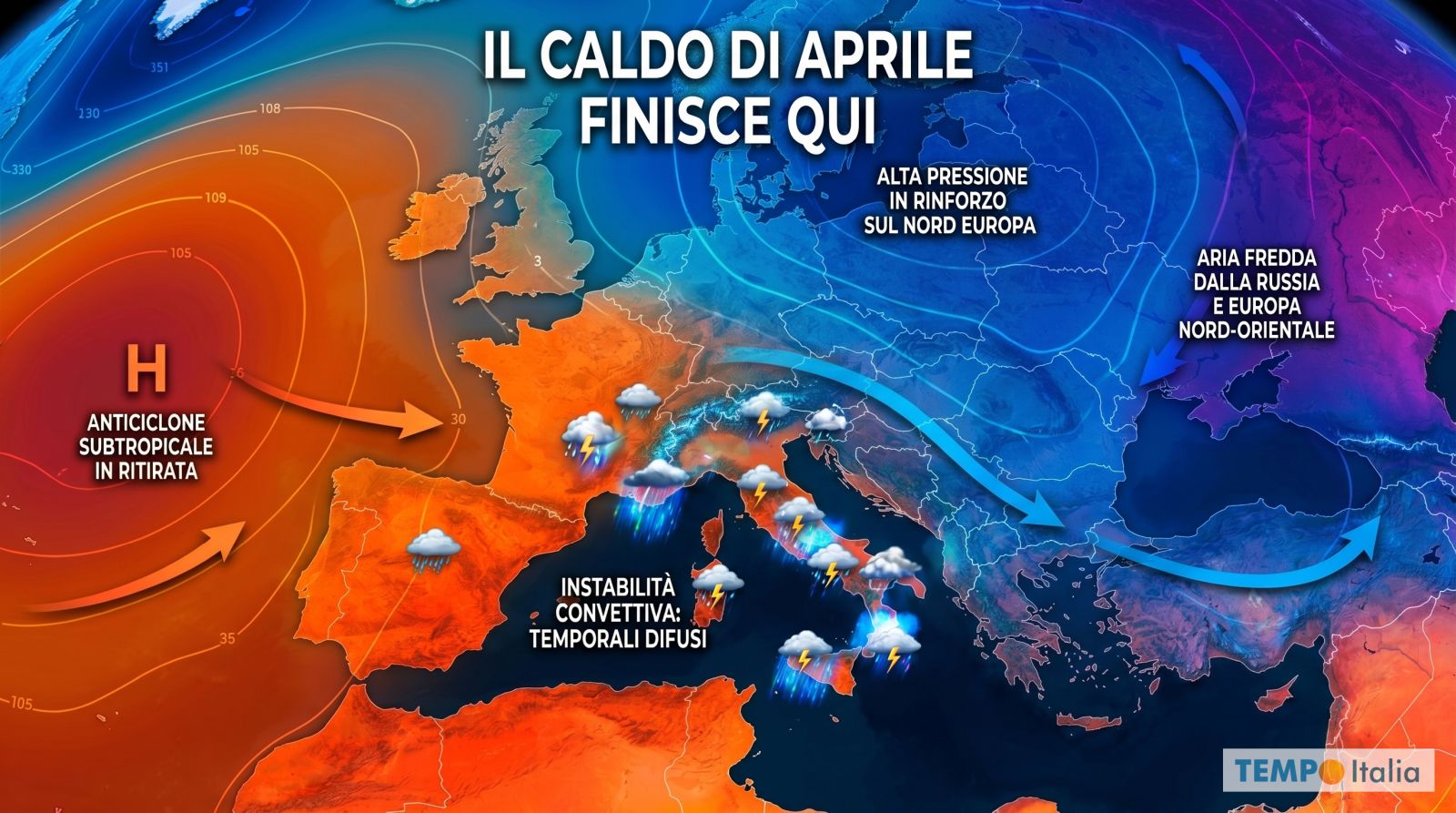 La causa del peggioramento è abbastanza chiara. Masse d’aria più fredde provenienti dalla Russia e dall’Europa nord-orientale stanno prendendo possesso della scena. Il promontorio anticiclonico subtropicale che aveva dominato fino al 19 Aprile è costretto a cedere e a spostarsi verso ovest, trascinandosi dietro il caldo anomalo di questi giorni. Al suo posto si insinuano correnti orientali, fresche e cariche di instabilità, che scorrono lungo il bordo meridionale di un campo di alta pressione che si va rinforzando sul Nord Europa.