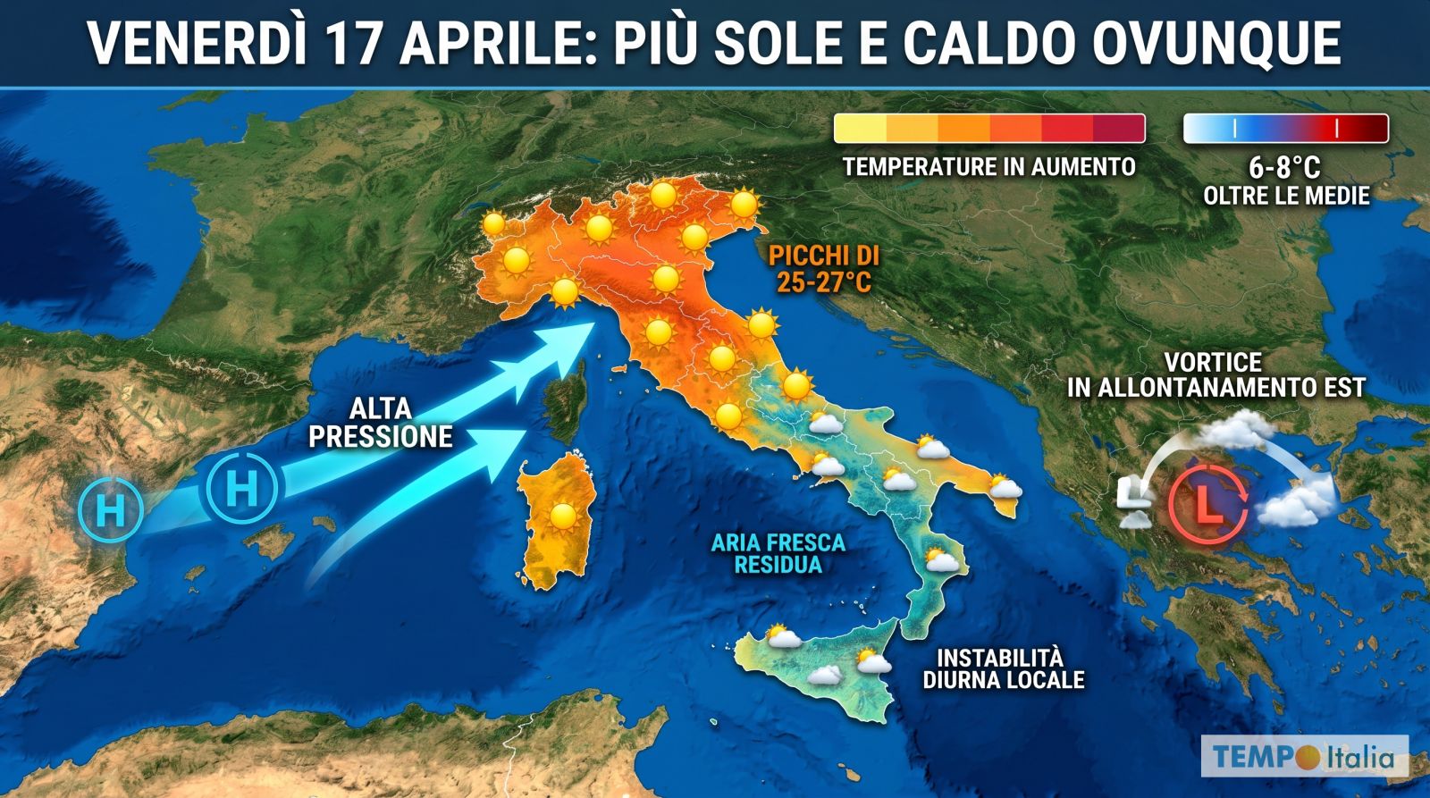 Da Venerdì 17 Aprile una nuova rimonta anticiclonica da ovest si farà più decisa, riportando il bel tempo con temperature in aumento grazie al soleggiamento diffuso. La colonnina di mercurio potrà toccare picchi di 25-27°C sulle aree interne del Centro-Nord, riportandosi nuovamente 6-8°C oltre le medie del periodo. Il vortice uscirà definitivamente di scena allontanandosi verso il Mediterraneo orientale, anche se residue infiltrazioni di aria fresca da Nord manterranno qualche nota di instabilità diurna al Sud e sulla dorsale appenninica, dove anche le temperature risentiranno della circolazione più fresca.