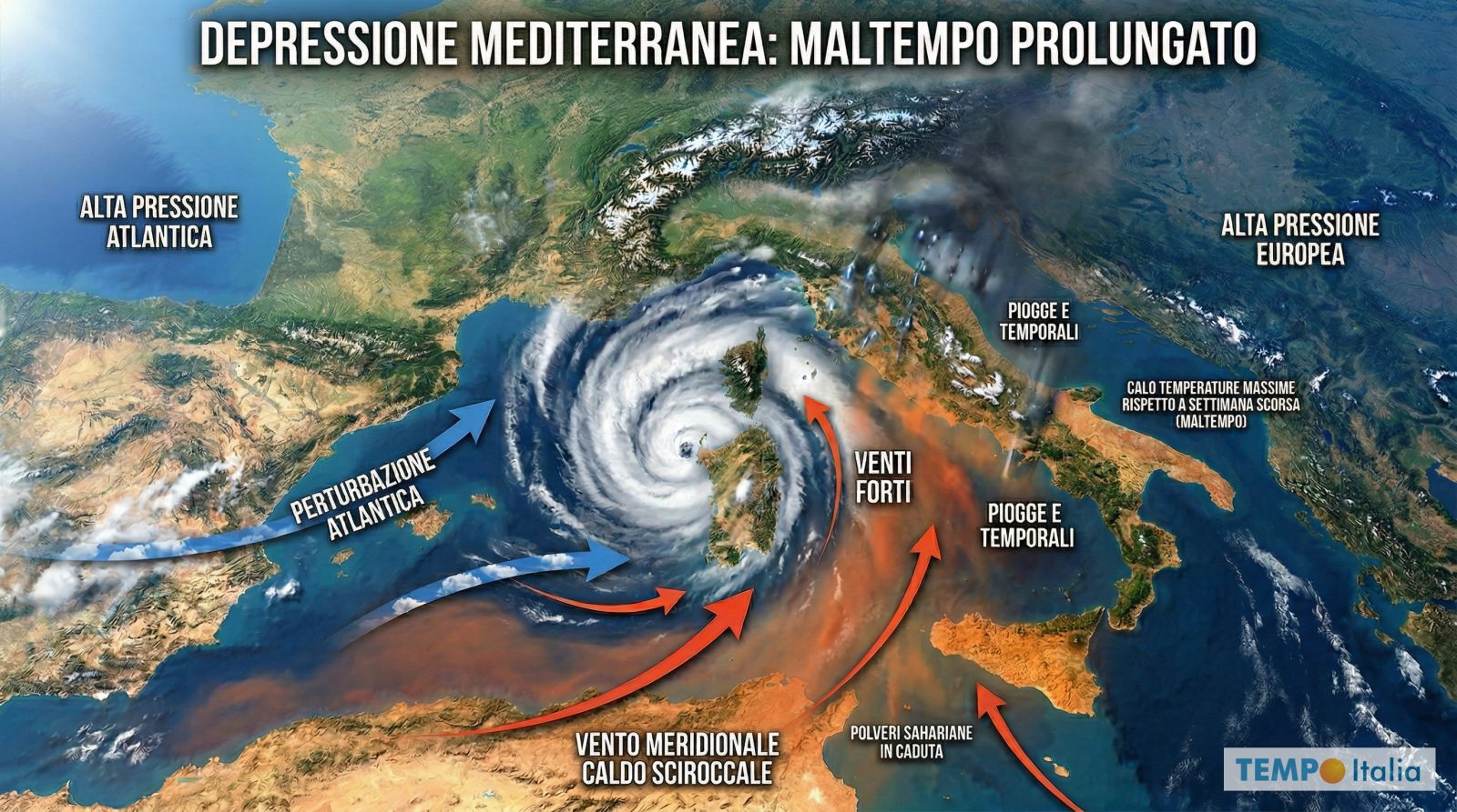 (TEMPOITALIA.IT) L’Italia si trova sotto la presa di una depressione centrata sulla Sardegna, nata dalla fusione di un vortice africano e di una perturbazione atlantica. Questo sistema intende farci compagnia per diversi giorni, trovandosi intrappolato tra l’alta pressione atlantica e quella europea, senza una facile via d’uscita. Il risultato è una fase di maltempo prolungata, con piogge, temporali e venti forti che dal Centro-Nord si sposteranno gradualmente verso il Sud, in un quadro di spiccata variabilità che è, in fondo, il marchio di fabbrica di questo Aprile.
