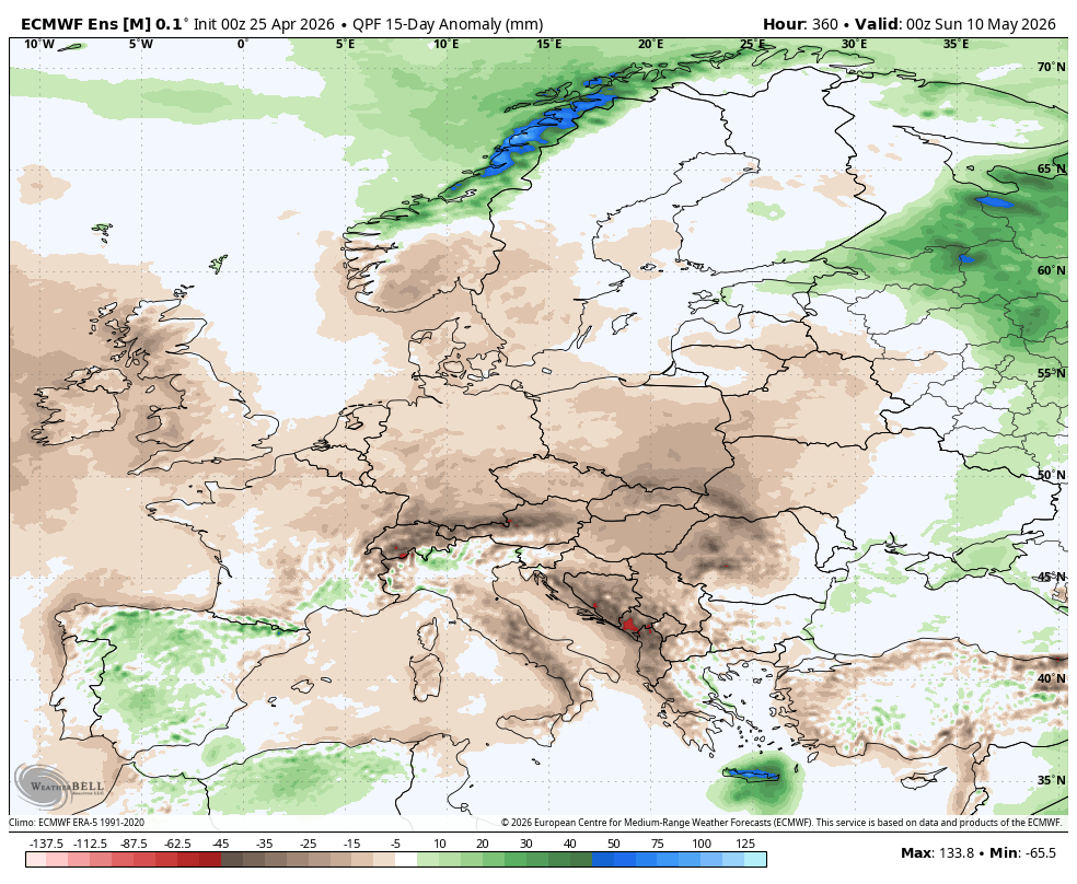 Pioggia sopra la media nuovamente nella Penisola Iberica; e poi sotto la media, ma molto – con quel rosso intenso – addirittura sulle Alpi, sulle Isole Britanniche nord-occidentali, sul Portogallo nord-occidentale e sulla Spagna nord-occidentale, così come sulle coste meridionali della Scandinavia. Significa che ci sarà un Atlantico – ovvero correnti atlantiche – non produttrici di precipitazioni.