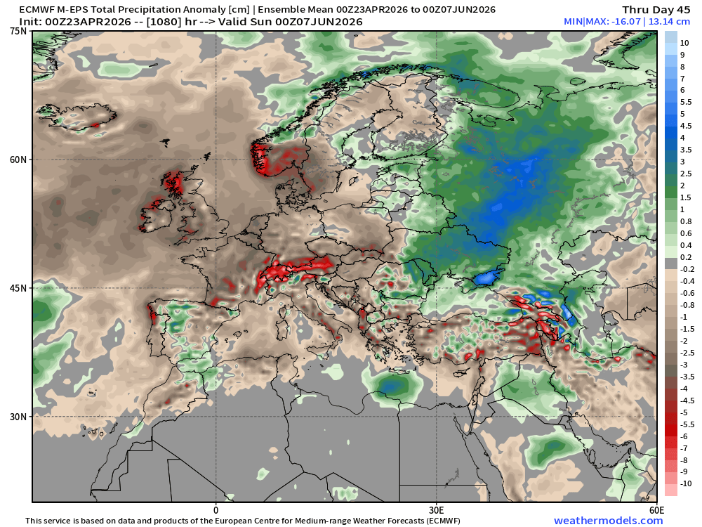 Ho voluto poi spaziare ancora oltre, andando a una previsione del modello matematico europeo a 46 giorni: siamo veramente molto avanti nel tempo. Sembrerebbe che la stagione delle piogge non voglia prendere piega né sulle regioni del Nord Italia né sull’Europa centrale e settentrionale, Isole Britanniche comprese, perché vediamo questi colori marroni che sono indice di accumuli inferiori alla norma. Pioggia sopra la media sostanzialmente solo in Russia, e poi – di nuovo, stranamente – verso Creta; tra le altre cose anche in Iraq, sull’Arabia Saudita, addirittura su una zona di Dubai, perché in questa cartina si vede così.