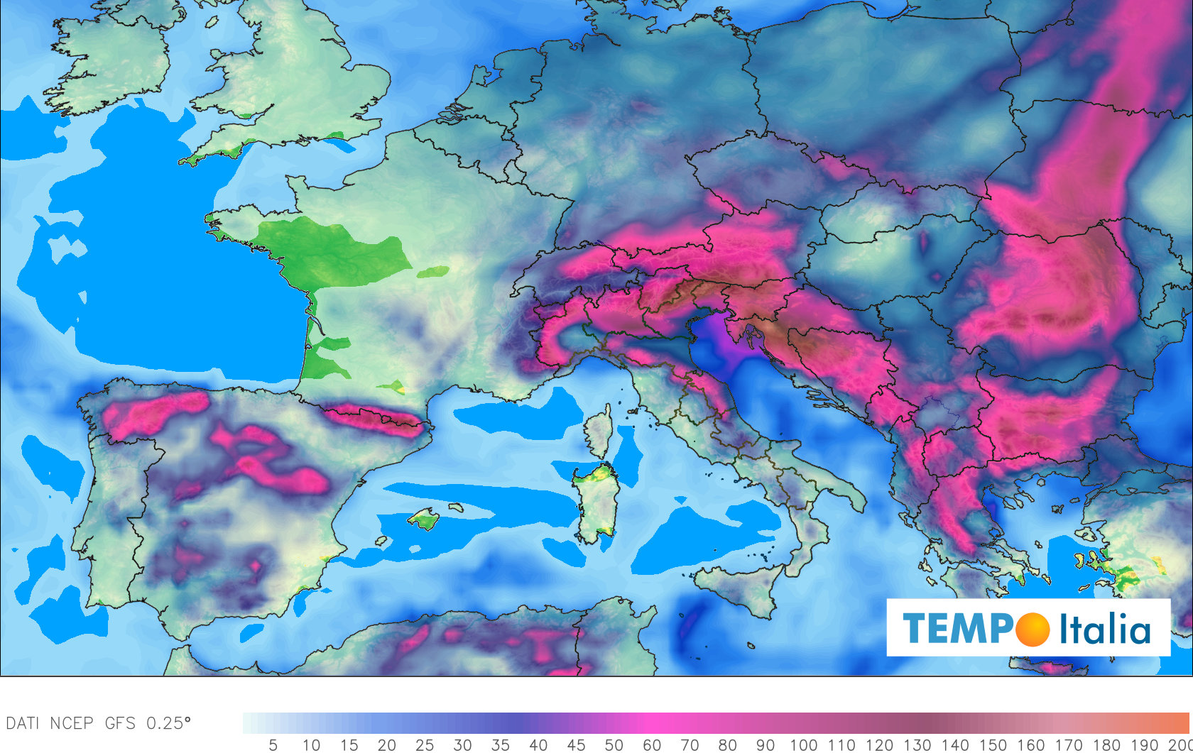 (TEMPOITALIA.IT) Osservando le mappe degli ultimi dati dei modelli matematici, rileviamo che la stagione delle piogge – perlomeno per le regioni del Nord Italia e parte del Centro – sembra essere imminente. Vi mostriamo infatti una cartina decisamente eloquente: si tratta di una previsione a due settimane, in cui il colore violetto identifica le aree d’Italia maggiormente interessate dalle precipitazioni.