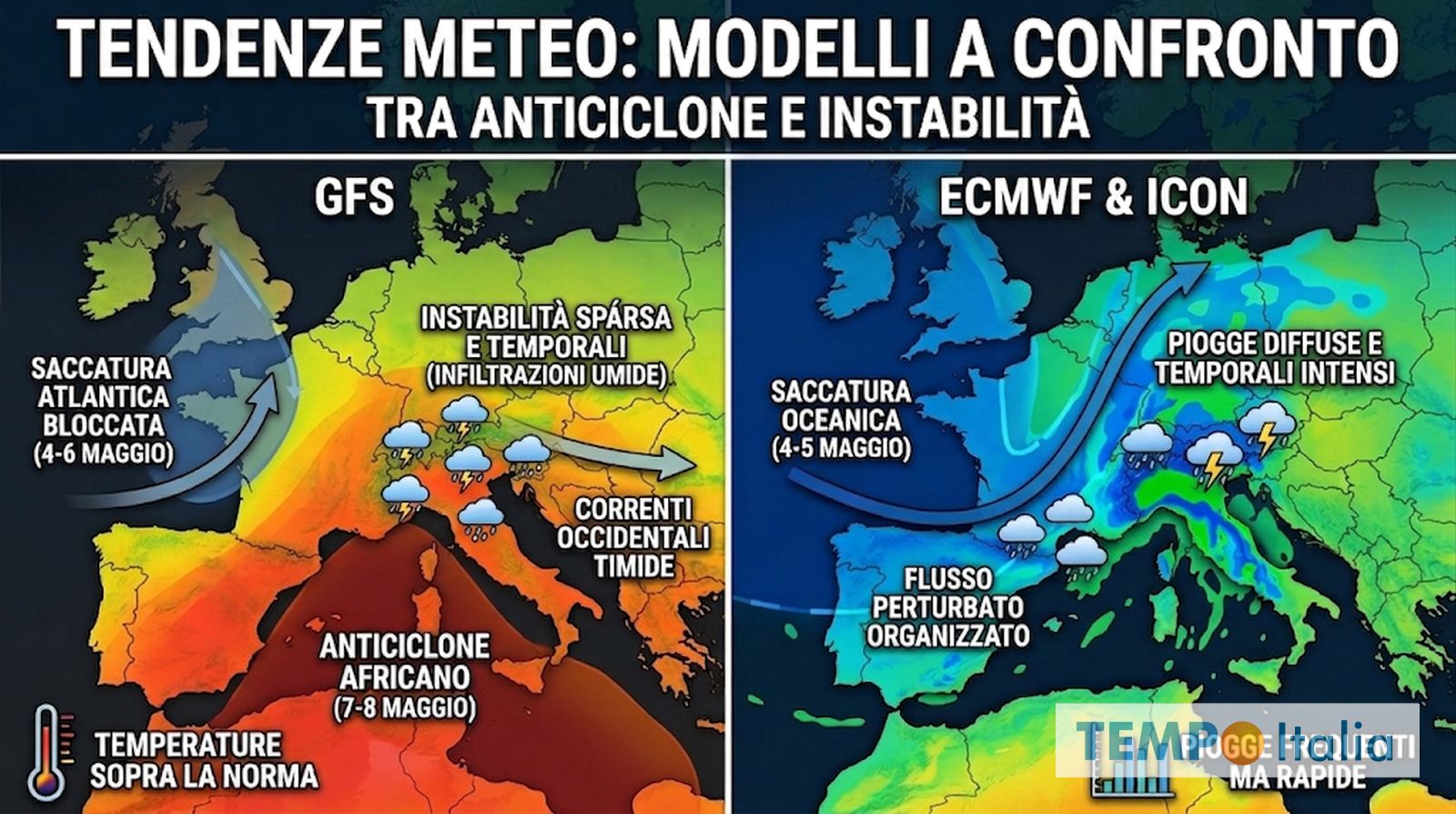 Il modello europeo ECMWF, affiancato in questa lettura dal tedesco ICON che si muove su posizioni analoghe, racconta una storia diversa. Secondo queste simulazioni, attorno al 4-5 Maggio l’anticiclone potrebbe subire un cedimento più deciso, aprendo uno varco alle correnti atlantiche verso il Mediterraneo. Una saccatura oceanica riuscirebbe a fare breccia investendo in primo luogo il Nord Italia con piogge diffuse, rovesci e temporali. Una finestra che potrebbe estendersi anche all’Europa occidentale, con Francia e Spagna coinvolte da un flusso perturbato più organizzato.