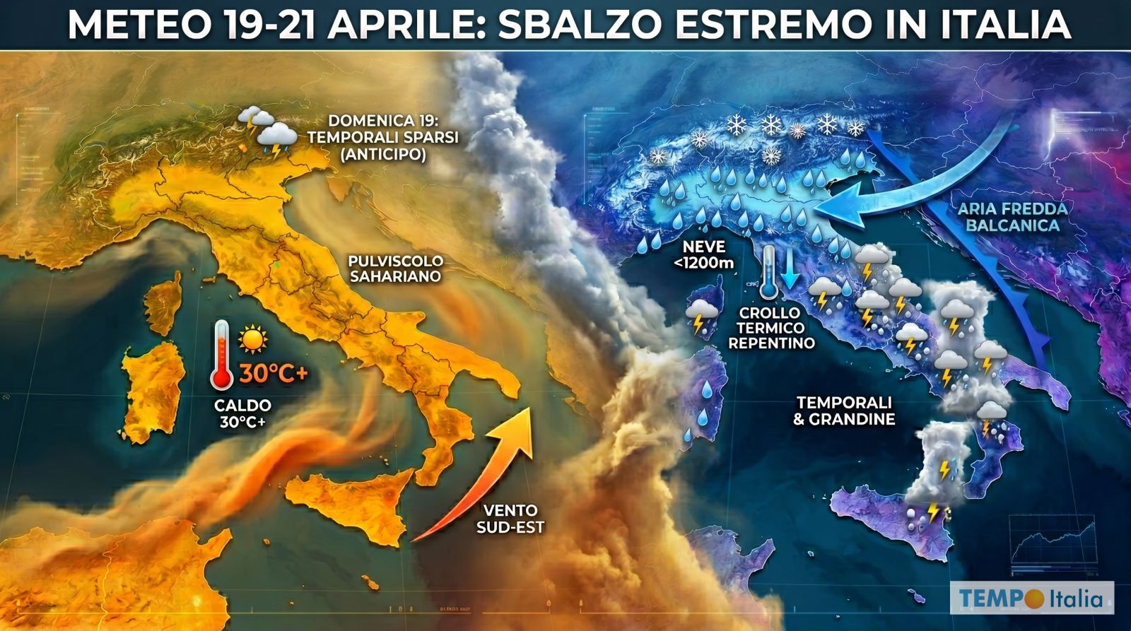 (TEMPOITALIA.IT) Nel giro di una sola giornata. È questo il tempo che basterà per passare da un caldo quasi estivo a condizioni che ricordano più l’inverno che la fine di Aprile. Un ribaltamento rapido, già anticipato nei giorni scorsi ma che le ultime proiezioni del modello europeo ECMWF e del modello americano GFS confermano con crescente precisione, anche se con qualche differenza negli scenari.