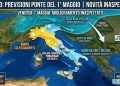 Qui arriva la novità più rilevante rispetto alle previsioni dei giorni scorsi. Secondo gli ultimi dati ECMWF, il cavo continentale più freddo proveniente da nord potrebbe transitare un po’ più a est del previsto, alleggerendo sensibilmente l’instabilità sull’Italia. Il risultato sarebbe un Venerdì 1° Maggio non del tutto compromesso: le regioni settentrionali, soprattutto quelle occidentali e buona parte del Centro, dalla Toscana alle Marche settentrionali, potrebbero godere di condizioni sostanzialmente buone con ampio soleggiamento. I fenomeni si concentrerebbero invece sulle aree a sviluppo diurno del Centro-Sud, dal Lazio e dall’Abruzzo verso le regioni meridionali, con rovesci e qualche temporale pomeridiano sui rilievi tra Calabria e Sicilia e localmente sui rilievi sardi. Un contesto non idilliaco, ma meno penalizzante di quanto si temeva.