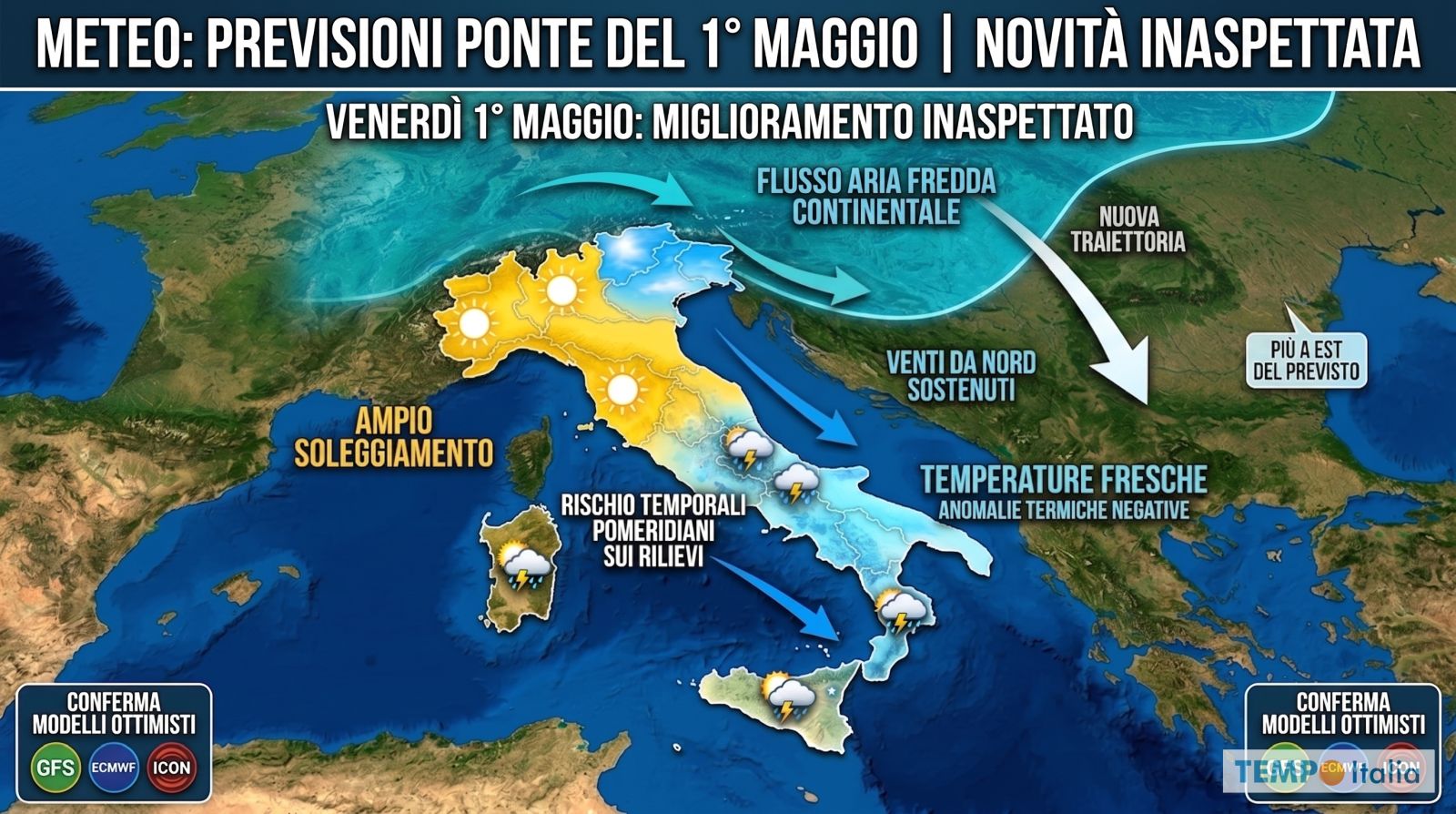 (TEMPOITALIA.IT) Il primo ponte festivo lungo del 2026 è quello che tutti stavano aspettando. Venerdì 1° Maggio cade in modo da regalare tre giorni consecutivi di riposo, e comprensibilmente in molti hanno già fatto i conti con ferie, gite e programmi all’aperto. Le previsioni degli ultimi giorni avevano dipinto uno scenario piuttosto cupo, con una perturbazione fredda pronta a compromettere l’intero lungo weekend. Gli ultimissimi aggiornamenti di ECMWF, GFS e ICON ridimensionano però in buona parte questa lettura, pur senza cancellare le insidie.