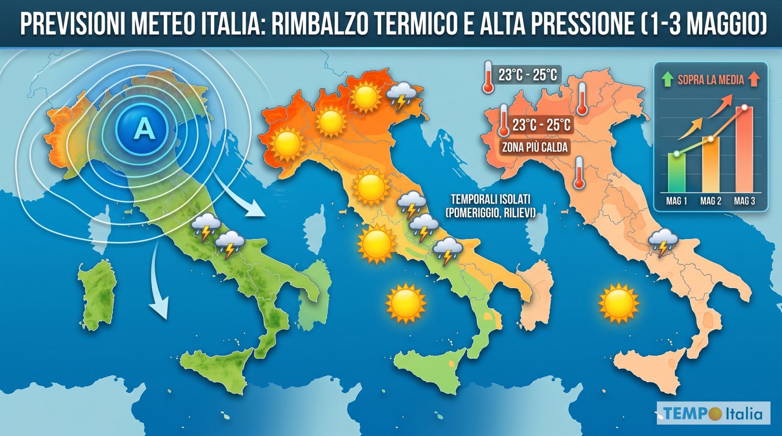 Qualunque sia lo scenario che si realizzerà, una tendenza emerge con chiarezza: tra Venerdì 1 e Domenica 3 Maggio le temperature risaliranno con una certa rapidità su buona parte dell’Italia, riportandosi leggermente sopra la media del periodo. Il Nord sarà ancora una volta la zona più calda: nelle vallate alpine e nelle pianure del Nord-Ovest si potrebbero toccare facilmente i 23°C e 25°C. Un rimbalzo termico piuttosto marcato, considerando che pochi giorni prima si avrà avuto il freddo fuori stagione di fine Aprile.