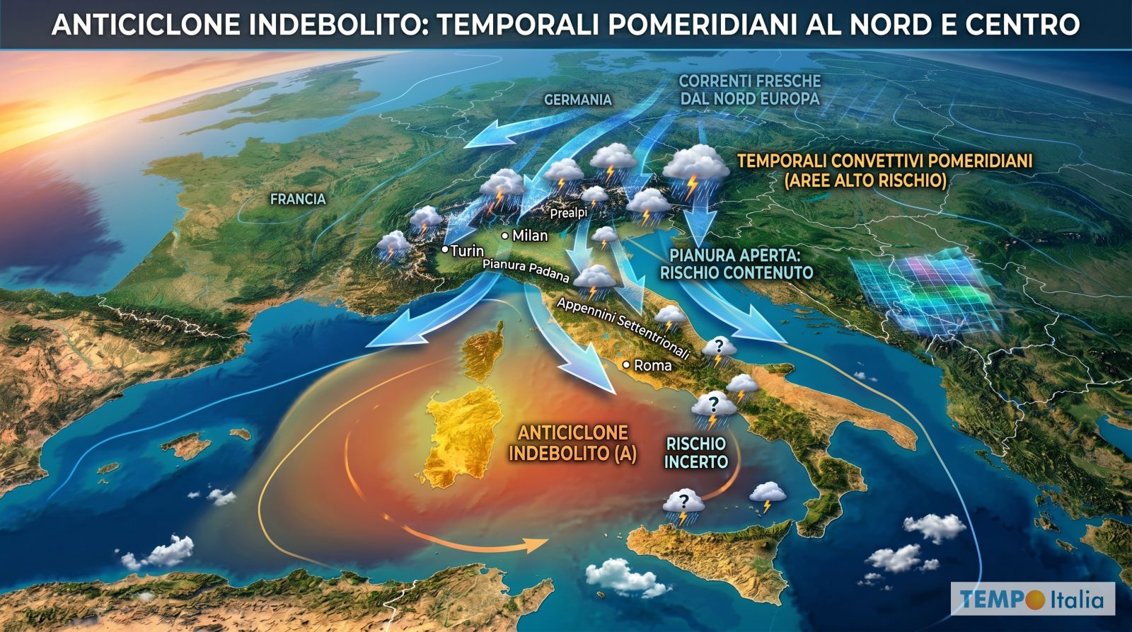L’alta pressione che dovrebbe accompagnare il ponte non si presenta nelle condizioni migliori. Le proiezioni disponibili mostrano una struttura anticiclonica presente sull’Italia ma mal posizionata, con il bordo settentrionale esposto all’influenza di correnti più fresche provenienti dall’Europa centro-settentrionale. Questo tipo di configurazione, nella stagione primaverile avanzata, è sufficiente a innescare una variabilità diffusa, in particolare nelle ore più calde della giornata.