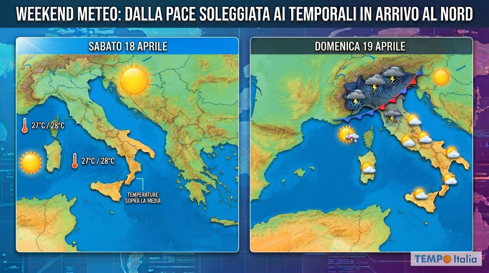 (TEMPOITALIA.IT) Il weekend parte nel migliore dei modi. L’anticiclone tiene saldamente le redini del tempo su gran parte dell’Italia, garantendo un Sabato 18 Aprile sostanzialmente soleggiato e gradevole. Le temperature si mantengono sopra la media, con picchi pomeridiani di 27°C e 28°C sulle regioni del versante tirrenico e sulla Sardegna. Qualche addensamento passeggero sui rilievi e qualche breve acquazzone nelle ore più calde sulle Alpi, sull’Appennino settentrionale e nelle zone interne sarde non cambierà la sostanza di una giornata ampiamente soleggiata. Questa tranquillità, però, ha i minuti contati.