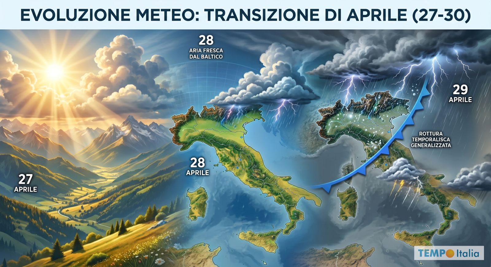 La vera rottura arriverà tra la notte di Martedì e la giornata di Mercoledì 29 Aprile. I fenomeni temporaleschi, alimentati dall’enorme quantità di energia accumulata in questi giorni di caldo anomalo, diventeranno più diffusi e intensi su tutto il Nord Italia. Dalle montagne scivolano verso la pianura, portando con sé grandinate, forti raffiche di vento e precipitazioni a carattere di rovescio. Le temperature subiranno un calo deciso, riportandosi verso i valori medi del periodo o anche qualche grado al di sotto, almeno temporaneamente.