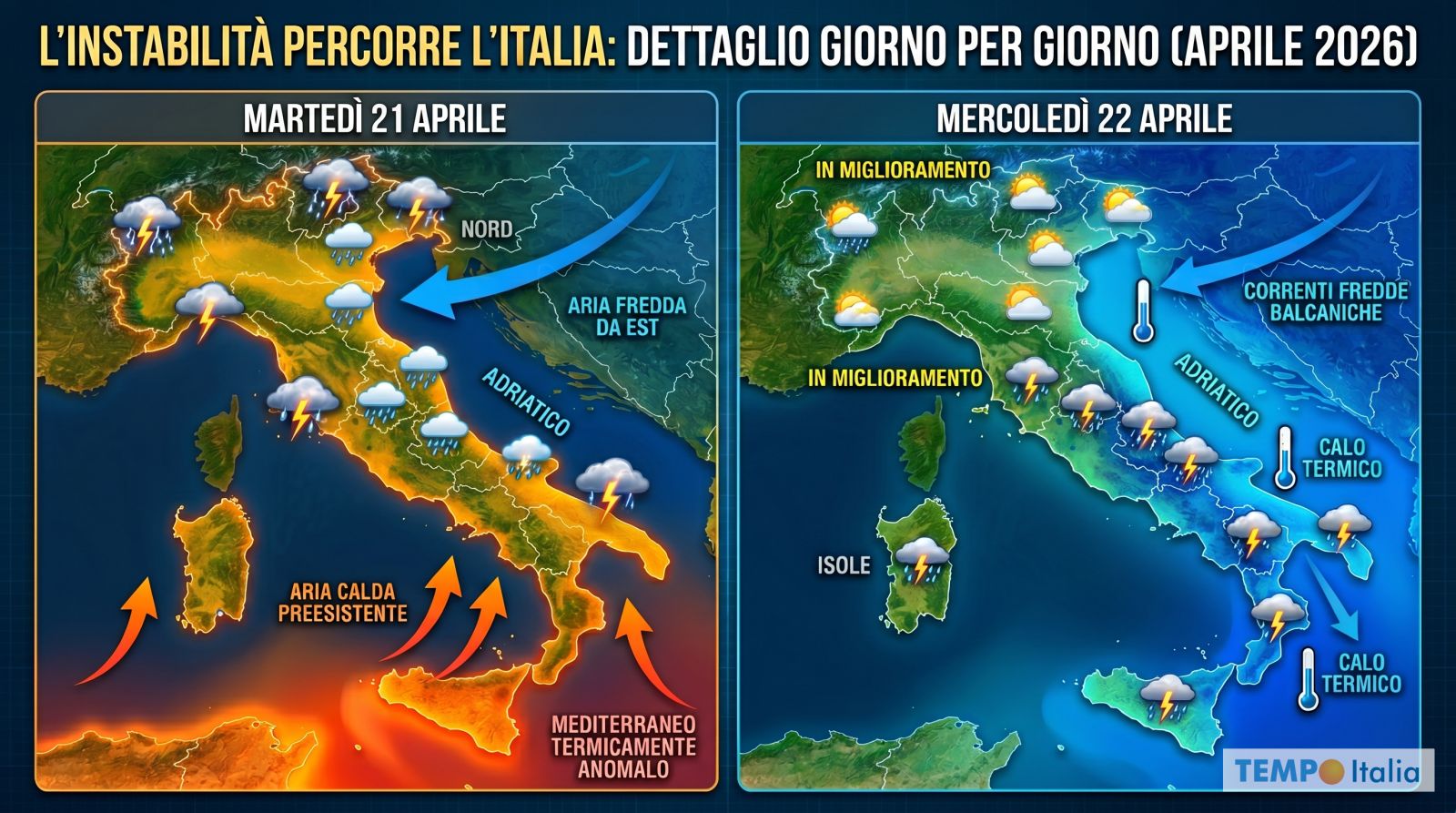Il contrasto termico tra le infiltrazioni fredde da est e l’aria molto più calda preesistente nei bassi strati è il motore di questa fase turbolenta. Un meccanismo ben noto, ma che in questo Aprile 2026 trova condizioni particolarmente energetiche per via del Mediterraneo termicamente anomalo, che amplifica l’intensità dei fenomeni convettivi nelle aree di maggiore contrasto.