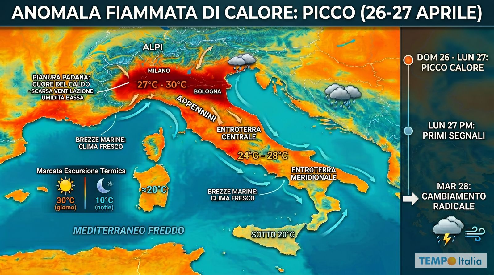 L’apice termico di questa anomala fiammata di fine Aprile si raggiungerà tra Domenica 26 e Lunedì 27, quando le temperature diurne nelle zone interne, lontane dall’effetto mitigante del mare, assumeranno caratteristiche pienamente estive. Non così le notti, che saranno ancora fresche. Anche le coste godranno di un clima più fresco e gradevole grazie alle brezze provenienti da un Mediterraneo ancora relativamente freddo: lungo i litorali le massime si manterranno su valori più contenuti rispetto all’entroterra e in alcuni casi non riusciranno a superare i 20°C.