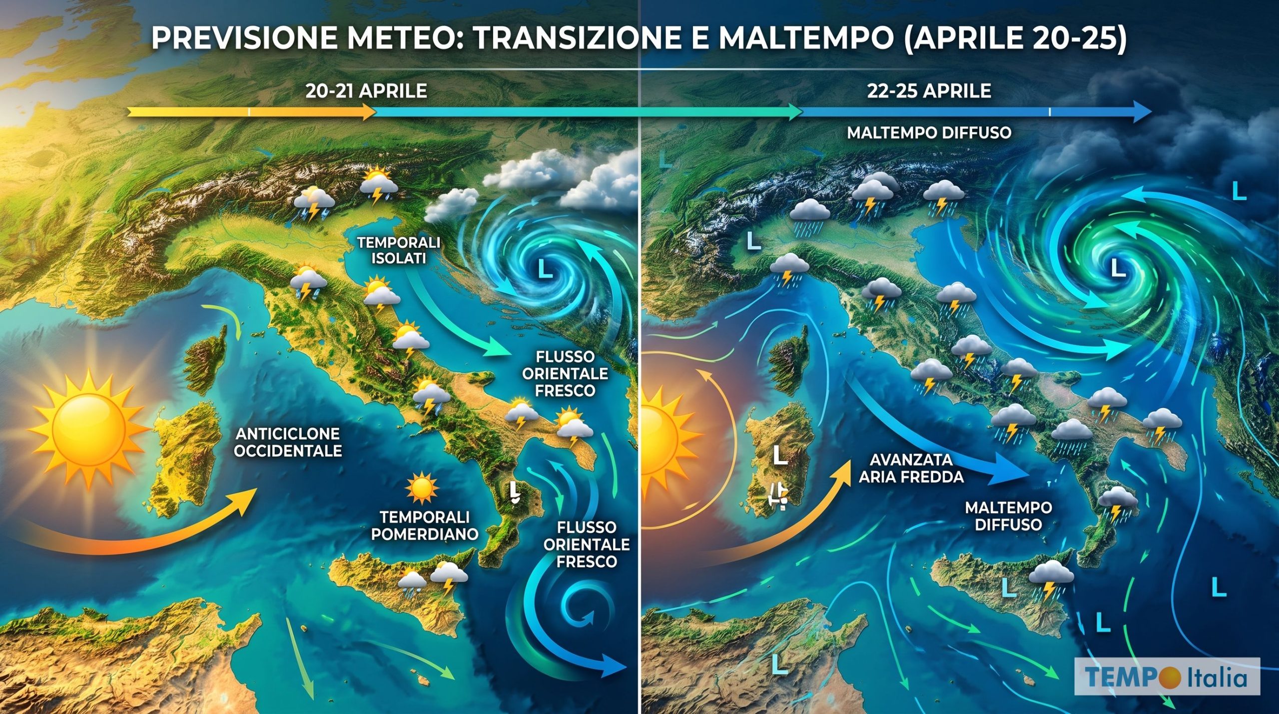 L’Italia si troverà inizialmente sospesa tra due influenze opposte: la stabilizzante presenza anticiclonica a ovest e la circolazione fresca e dinamica proveniente da est. Ma col passare dei giorni, dopo il 20 Aprile, sembra che l’influenza della circolazione fredda orientale diventerà preponderante.